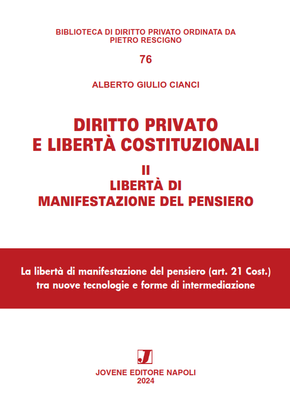 The volume Diritto privato e libertà costituzionali, II, Libertà di manifestazione del pensiero (Private Law and Constitutional Freedoms, II, Freedom of Speech), Naples, Jovene, 2024 (XV-510), in Biblioteca di Diritto privato series, ordered by Pietro Rescigno, 76, reconstructs the institution of freedom of expression of thought as a private subjective right, and evaluates its conflicts with other personality rights.